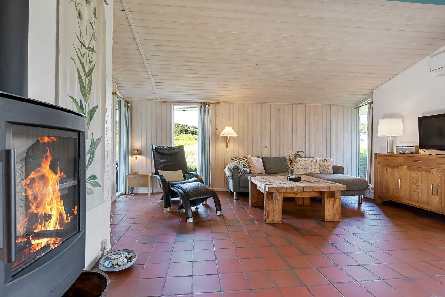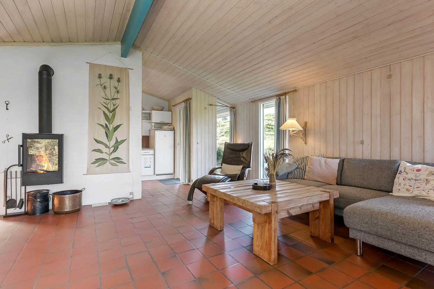 Gut genutztes Ferienhaus von etwa 90 m2 mit 3 Schlafzimmern (1DB, 1E, 1EB-120 x 200). Vom Wohnzimmer und von allen Schlafzimmern aus haben Sie einen Panoramablick auf die hohen Dünen an der Nordsee. Das Haus wurde zuletzt im Jahr 2013 renoviert und ist mit Polstermöbeln, Essbereich, Fernseher mit dänischen und deutschen Programmen und Chromecast ausgestattet, der das Streaming von TV / Radio / Apps und DVD-Player ermöglicht. Ein gemütlicher Kaminofen und eine Wärmepumpe sorgen für eine günstigere Stromrechnung und zusätzliche Gemütlichkeit und Wärme für die kühlerern Tage an der Nordsee. Praktische Küchenecke mit u.a. Geschirrspüler, Keramikkochfeld, eingebautem Backofen, Dunstabzugshaube und Kühlschrank mit Gefrierfach. Schönes Badezimmer mit Toilette, Waschbecken, Dusche und Fliesenboden mit Fußbodenheizung und Waschmaschine. Es gibt praktische Fliesenböden mit Fußbodenheizung im ganzen Haus. Haustier nicht erlaubt. Nichtraucher-Haus.