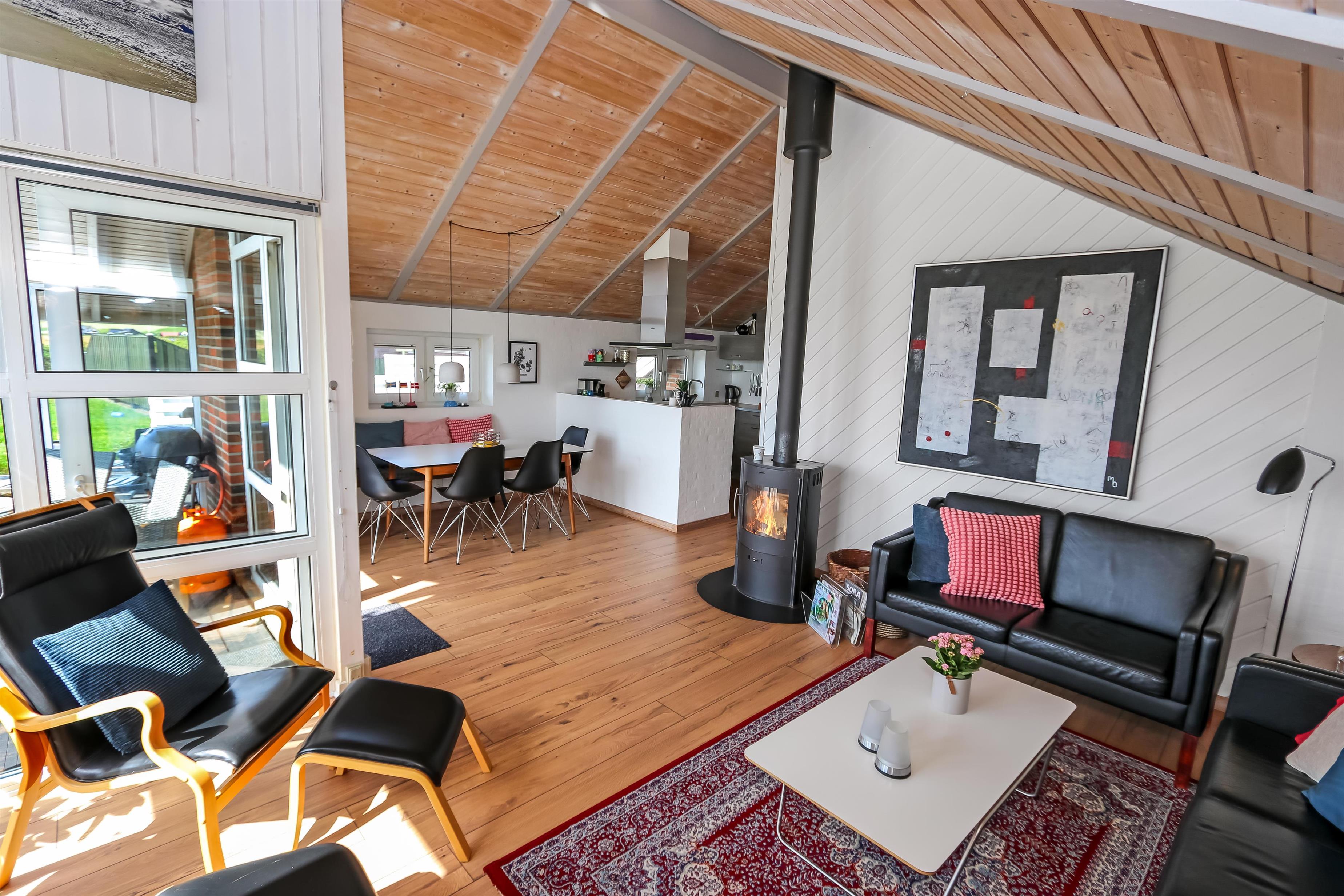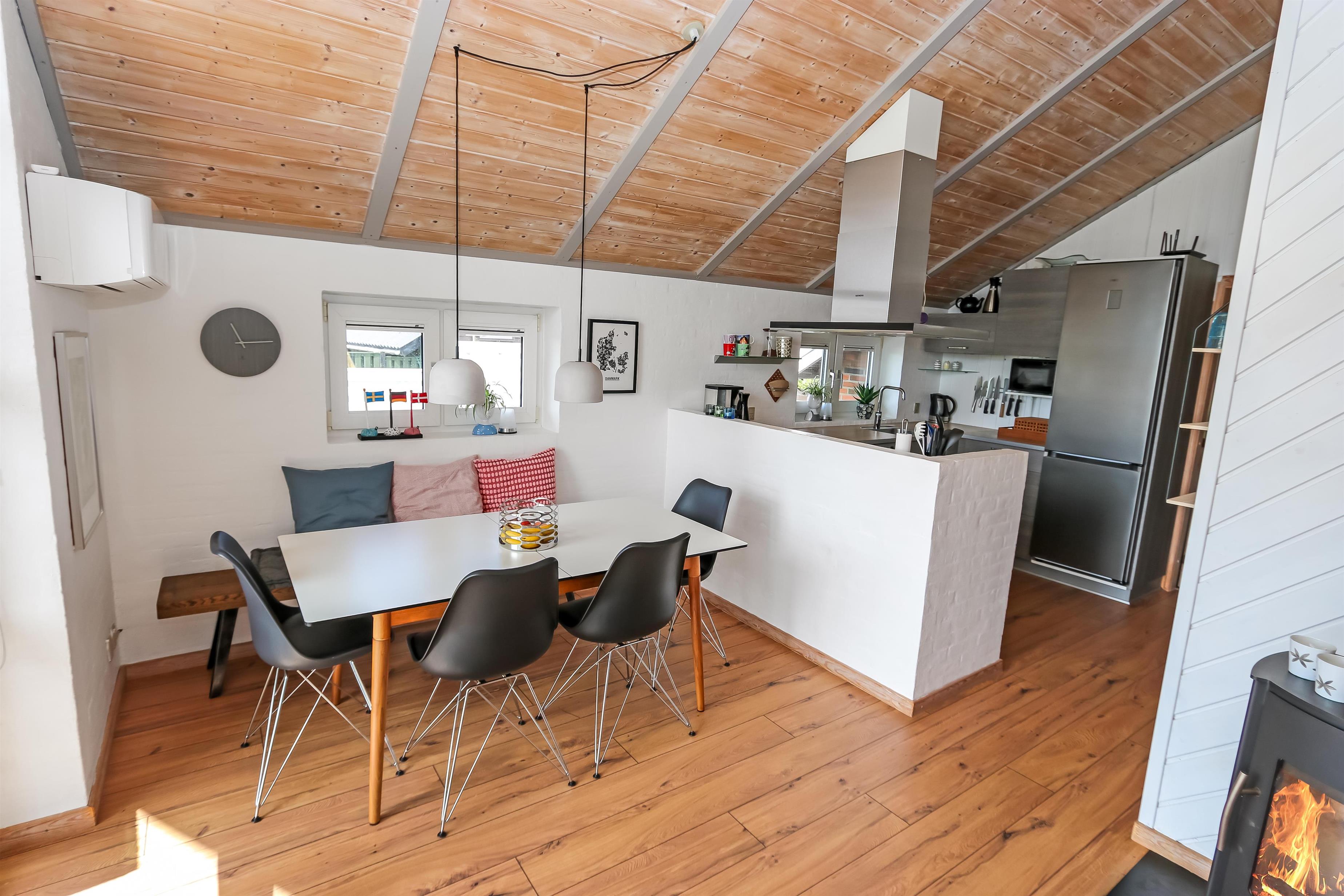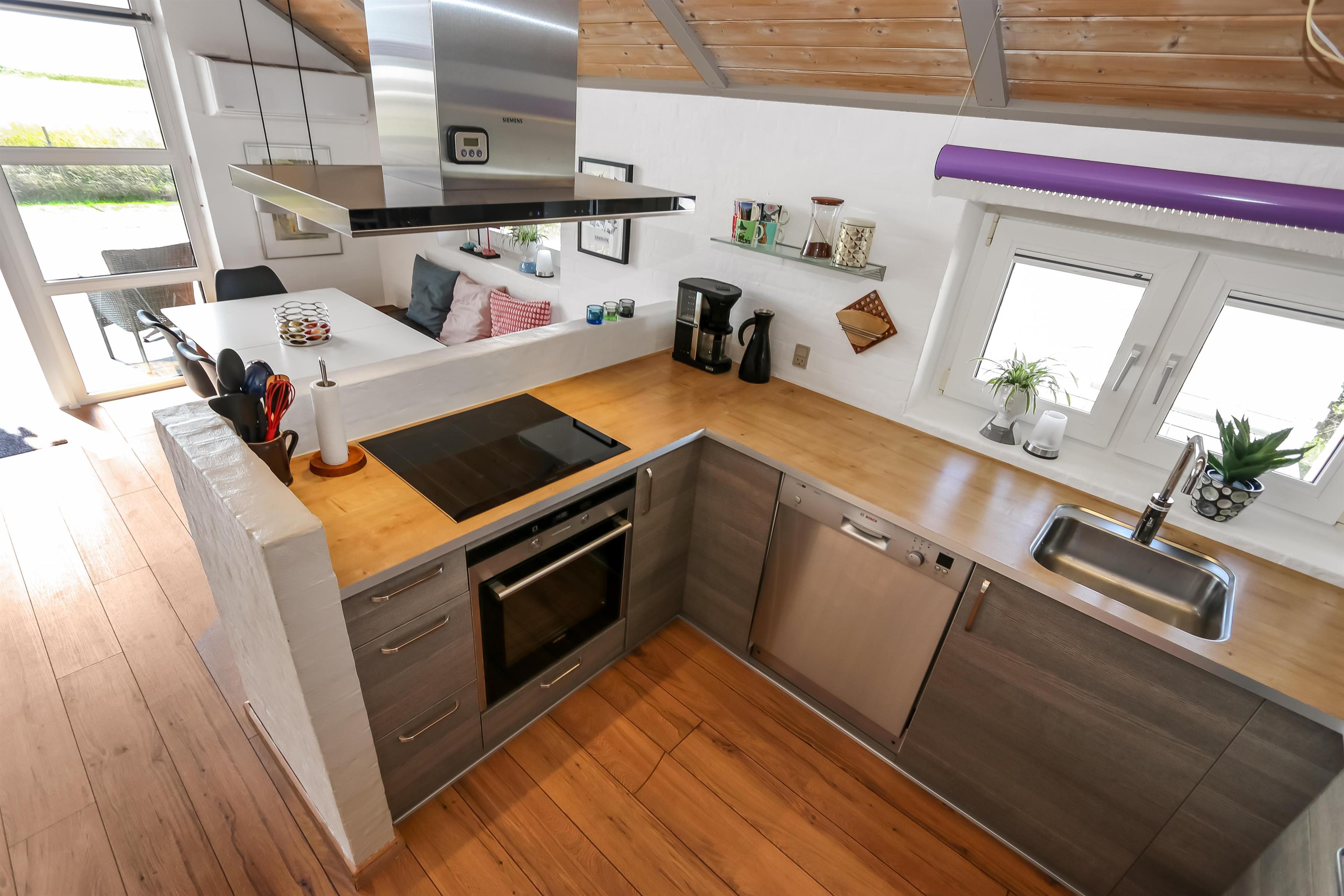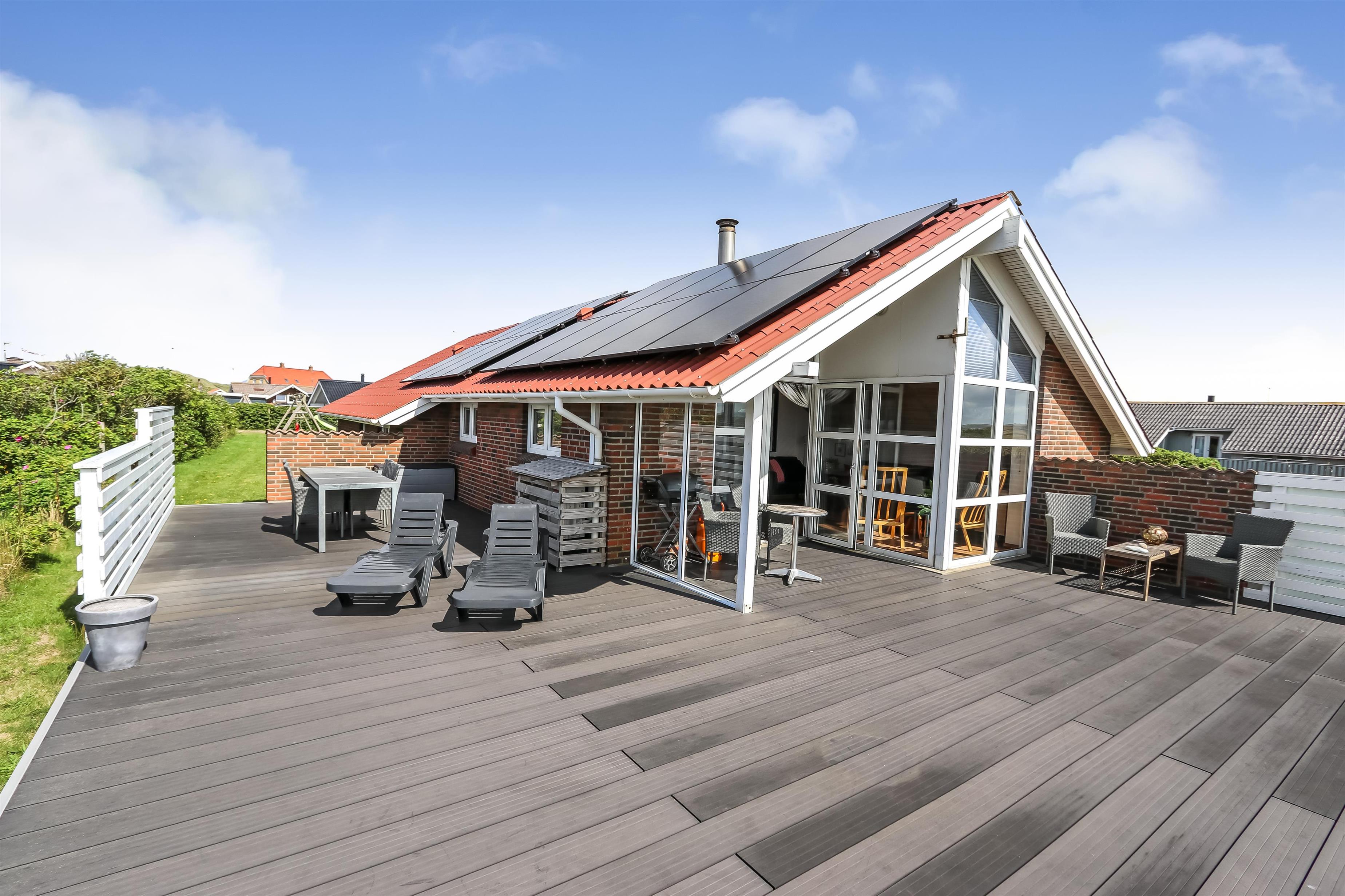 Dieses gut gelegene Ferienhaus hat 4 Schlafräume: 1DB + 1DB + 2B + 2B. Heller und offener Aufenthaltsraum, der bis zur Decke geöffnet ist. Er ist gemütlich eingerichtet mit Ledermöbeln, Essplatz, großem Smart-TV mit deutschen und dänischen Programmen und ein Chromecast für Streaming, wenn Sie selber dafür ein Gerät und ein Abonnement haben. Das Haus ist 110 qm groß und im Jahr 1994 erbaut. Schöner, gemütlicher Kaminofen und eine ökonomische Wärmepumpe sorgen für eine gemütliche Wärme im Haus, egal zu welcher Jahreszeit. Außerdem gibt es auf dem Dach Solarzellen und eine Batterie die bis 5 kw aufladen kann. Das Haus besitzt deshalb grüne Energie und der Verbrauch von Strom ist deswegen weiniger als bei anderen Häusern. Die schöne Küche ist gut ausgestattet es gibt z.B. Kaffeemaschine, Mikrowelle, Heißluft-Ofen, und Induktions-Herdplatte, Abzugshaube, Geschirrspüler und Kühlschrank mit Gefrierfach. Es gibt 2 schöne Badezimmer im Haus. Beide mit Toilette, Dusche, Waschbecken, Fliesenboden und eine mit Fußbodenheizung. Von der Terrasse und dem Wohnraum haben Sie eine tollen Panoramablick zum Ferring See und den Blick zu den hohen Dünen an der Nordsee. Nichtraucher-Haus. Max. 1 Haustier ist erlaubt.
