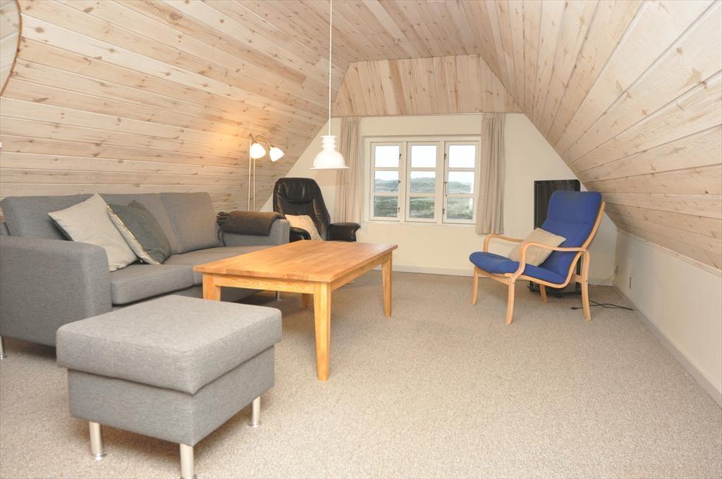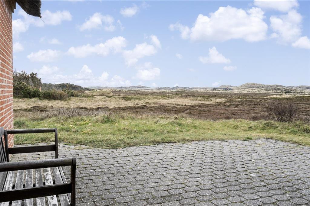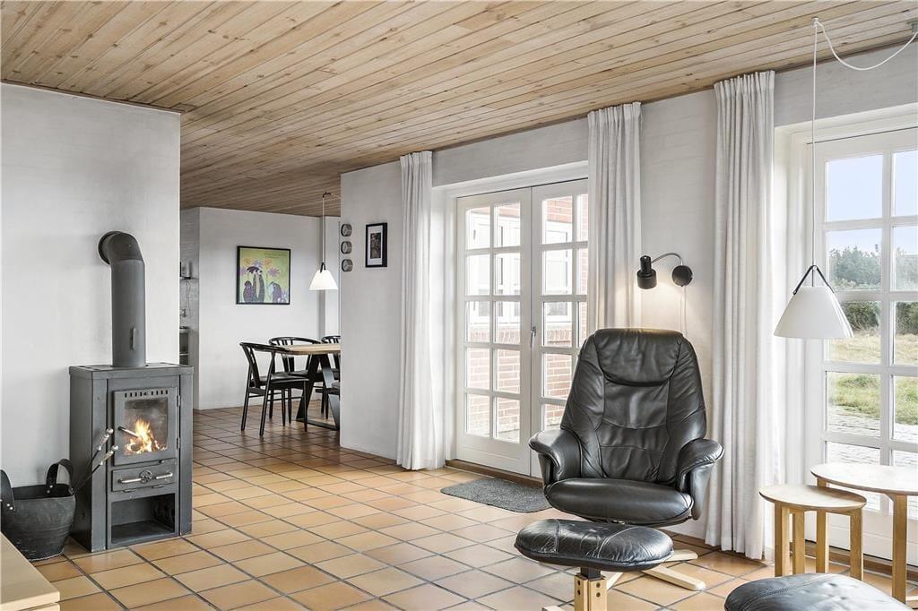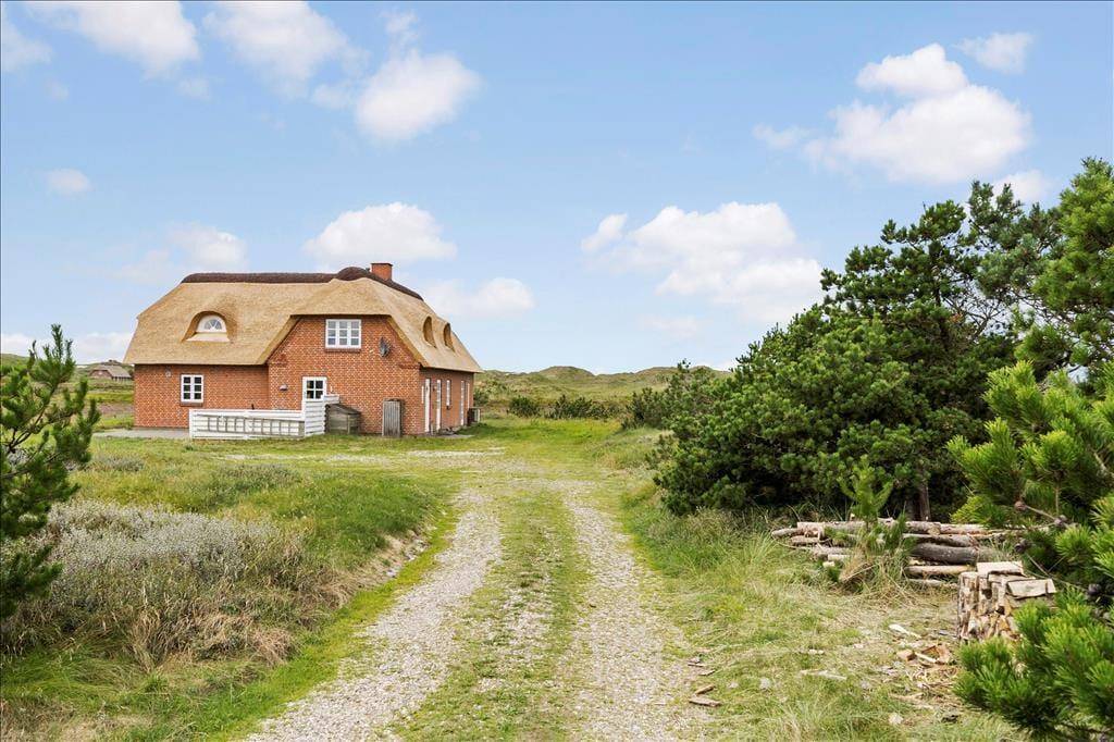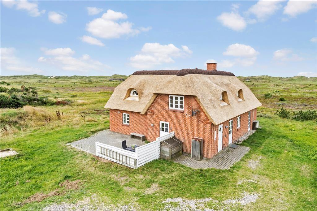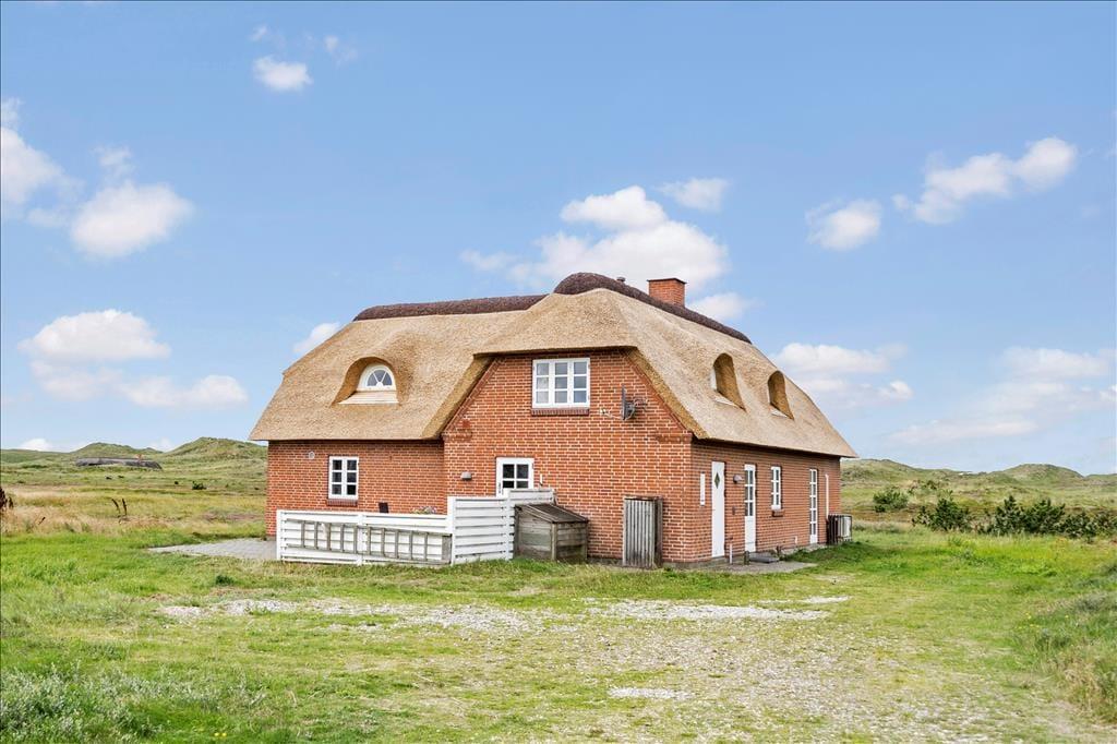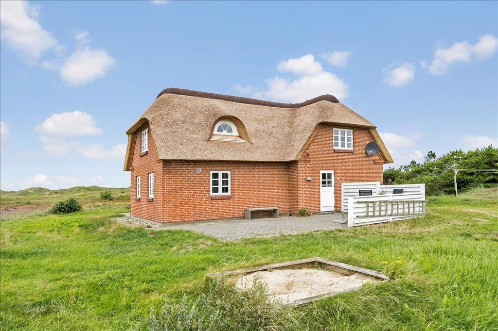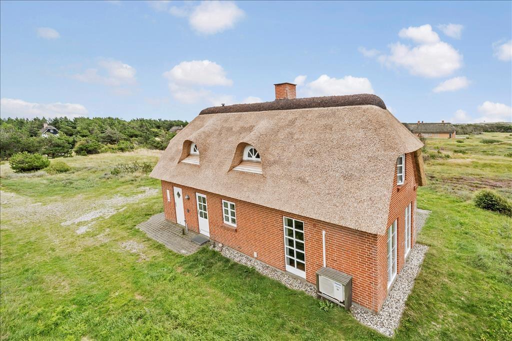Dieses Reetdachhaus bietet seinen Gästen eine komfortable und gemütliche Einrichtung. Im Wohnraum sorgt ein Kaminofen für Wärme und typische dänische Ferienhausstimmung. Durch die großen Fenster des Wohnraums eröffnet sich Ihnen ein prachtvoller Ausblick auf die Dünen. Die teilweise offene Küche verfügt unter anderem über einen Geschirrspüler, einen Backofen, einen Kühlschrank und eine Gefriermöglichkeit. Von der Küche gelangen Sie hinaus auf eine nach Südosten gerichtete Terrasse. Das schöne Badezimmer im Erdgeschoss verwöhnt mit einer Sauna, einer Dusche und einem Whirlpool. Im Obergeschoss ist praktischerweise ein Gäste-WC inklusive Dusche platziert. Zwei der insgesamt vier Schlafräume befinden sich im Erdgeschoss. Einer dieser Schlafräume ist mit einem Doppelbett versehen, der andere mit einem Etagenbett. Im Obergeschoss erwarten Sie ein Schlafraum mit einem Doppelbett und ein Schlafraum mit zwei Einzelbetten. Alle Schlafräume und der Aufenthaltsraum im Obergeschoss sind mit Teppichboden ausgelegt. Der Rest der Wohnfläche ist gefliest.
