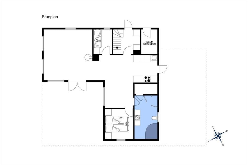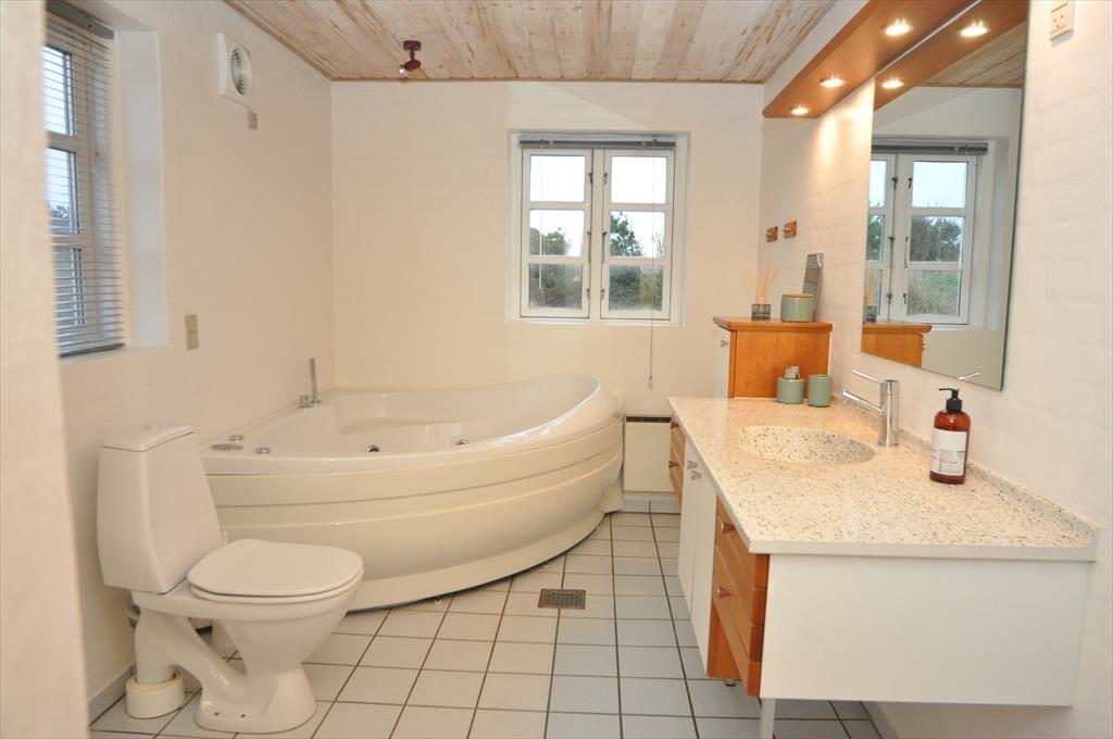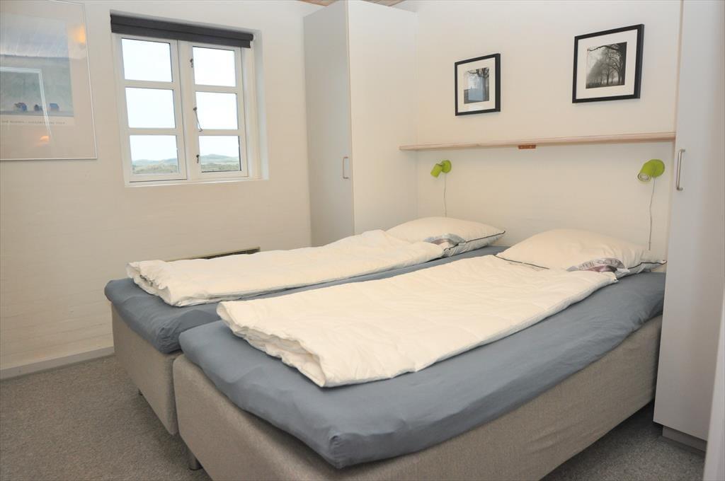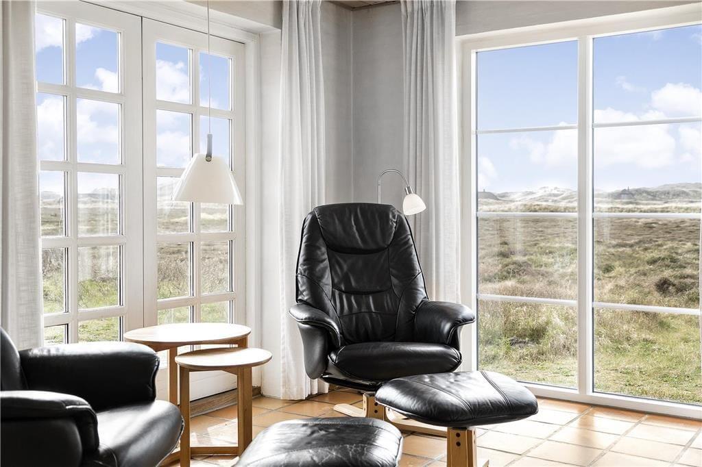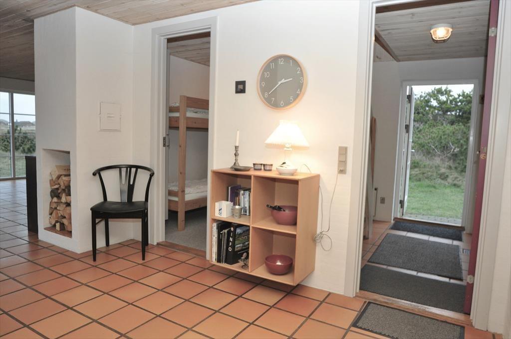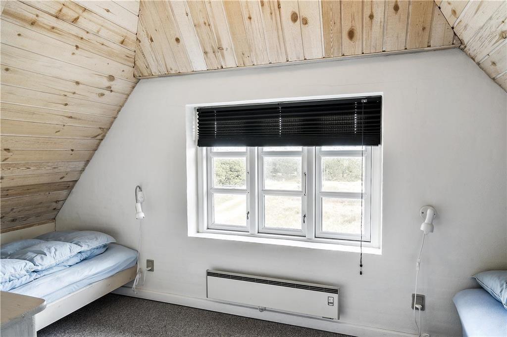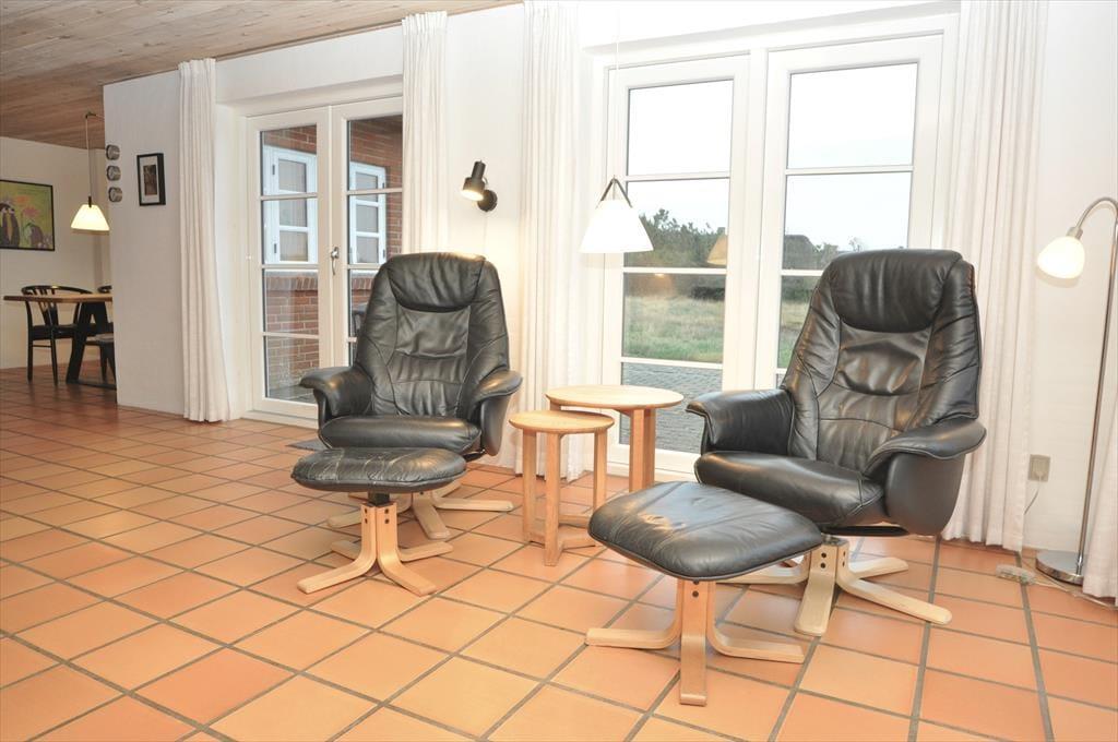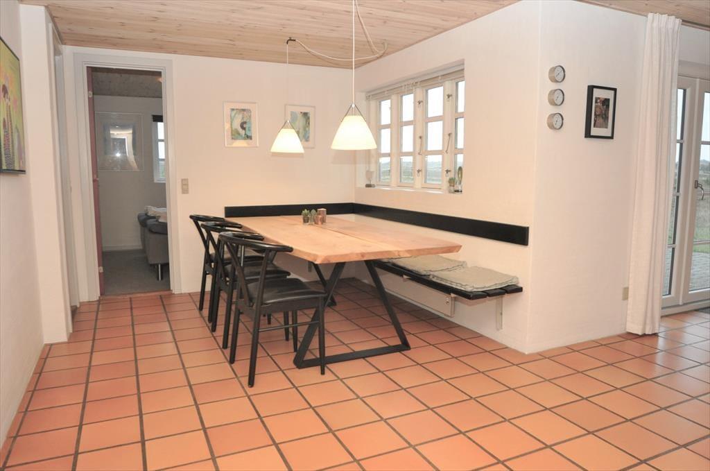 Dieses Reetdachhaus bietet seinen Gästen eine komfortable und gemütliche Einrichtung. Im Wohnraum sorgt ein Kaminofen für Wärme und typische dänische Ferienhausstimmung. Durch die großen Fenster des Wohnraums eröffnet sich Ihnen ein prachtvoller Ausblick auf die Dünen. Die teilweise offene Küche verfügt unter anderem über einen Geschirrspüler, einen Backofen, einen Kühlschrank und eine Gefriermöglichkeit. Von der Küche gelangen Sie hinaus auf eine nach Südosten gerichtete Terrasse. Das schöne Badezimmer im Erdgeschoss verwöhnt mit einer Sauna, einer Dusche und einem Whirlpool. Im Obergeschoss ist praktischerweise ein Gäste-WC inklusive Dusche platziert. Zwei der insgesamt vier Schlafräume befinden sich im Erdgeschoss. Einer dieser Schlafräume ist mit einem Doppelbett versehen, der andere mit einem Etagenbett. Im Obergeschoss erwarten Sie ein Schlafraum mit einem Doppelbett und ein Schlafraum mit zwei Einzelbetten. Alle Schlafräume und der Aufenthaltsraum im Obergeschoss sind mit Teppichboden ausgelegt. Der Rest der Wohnfläche ist gefliest.