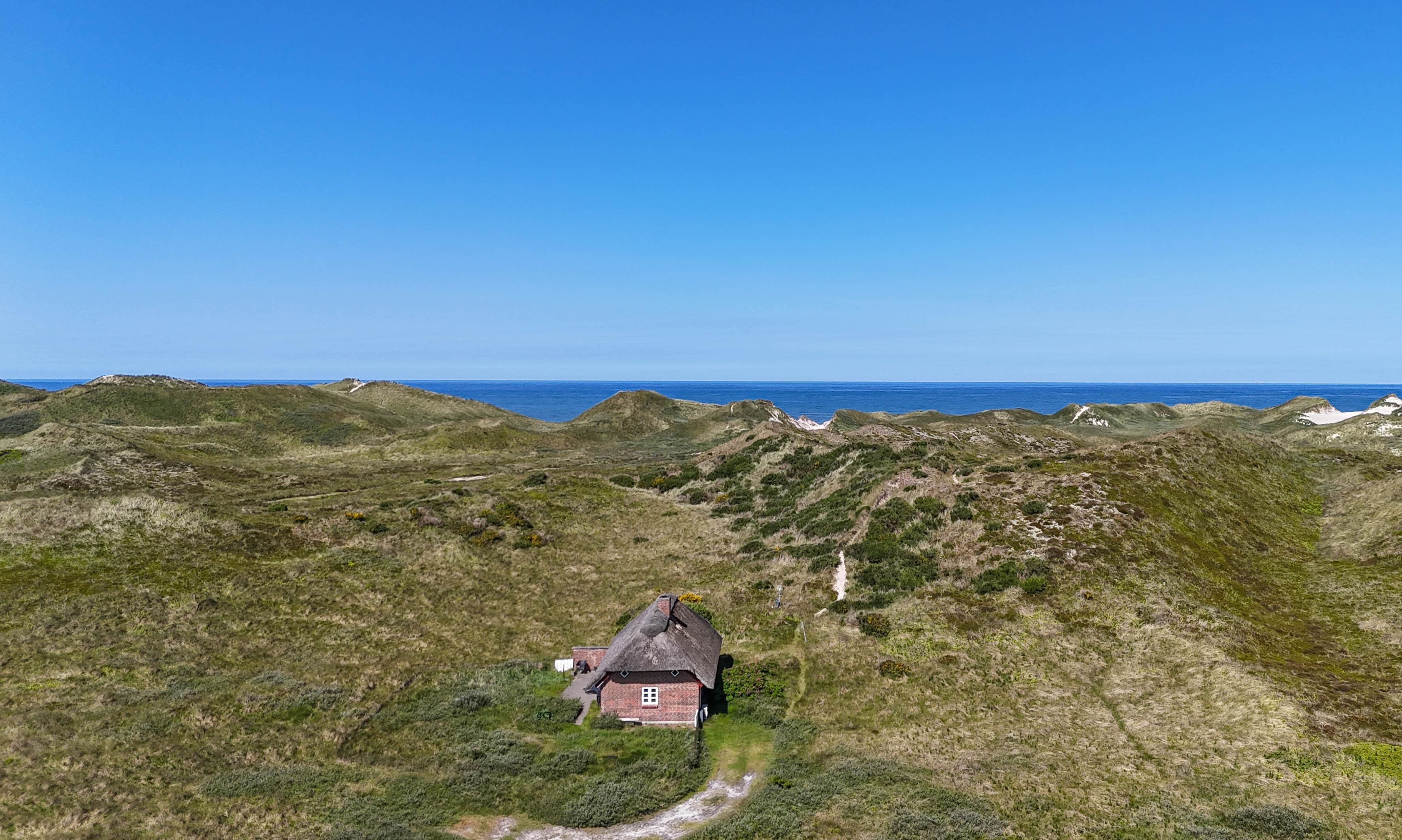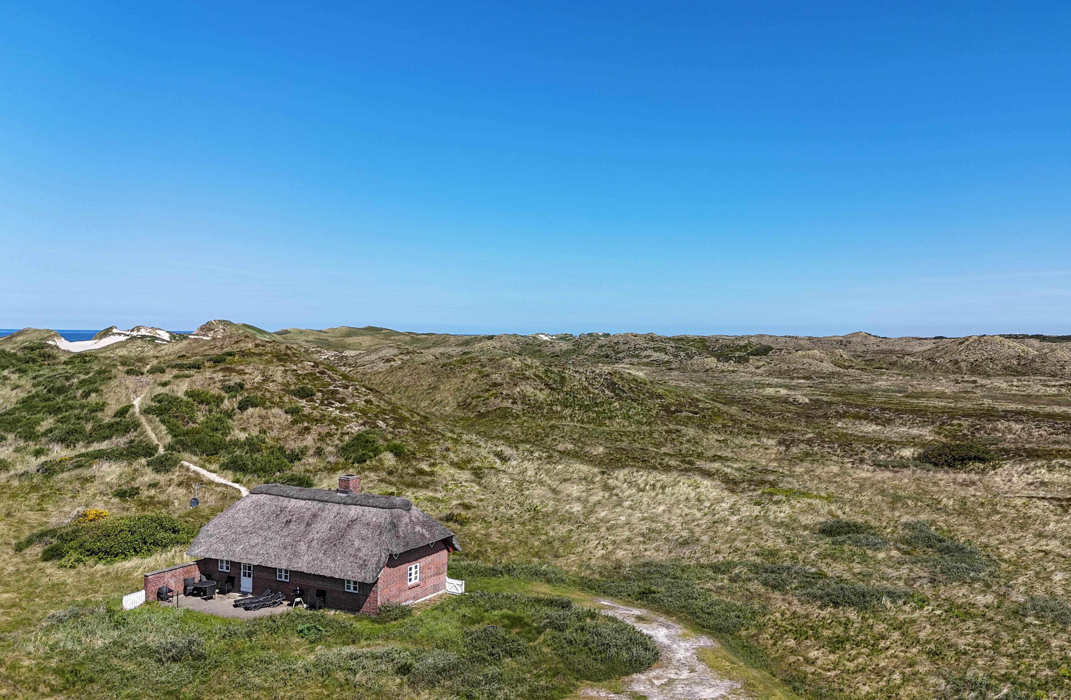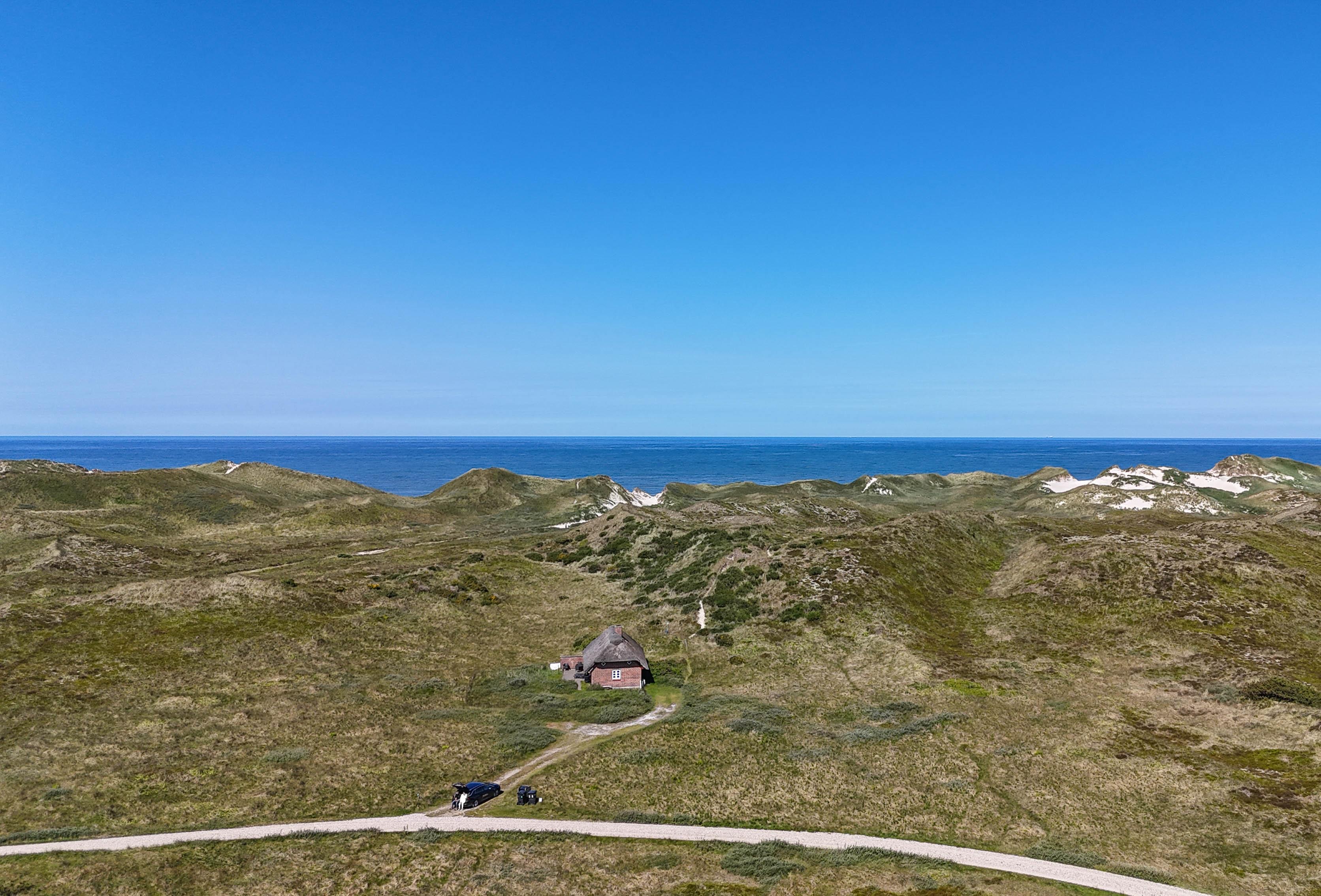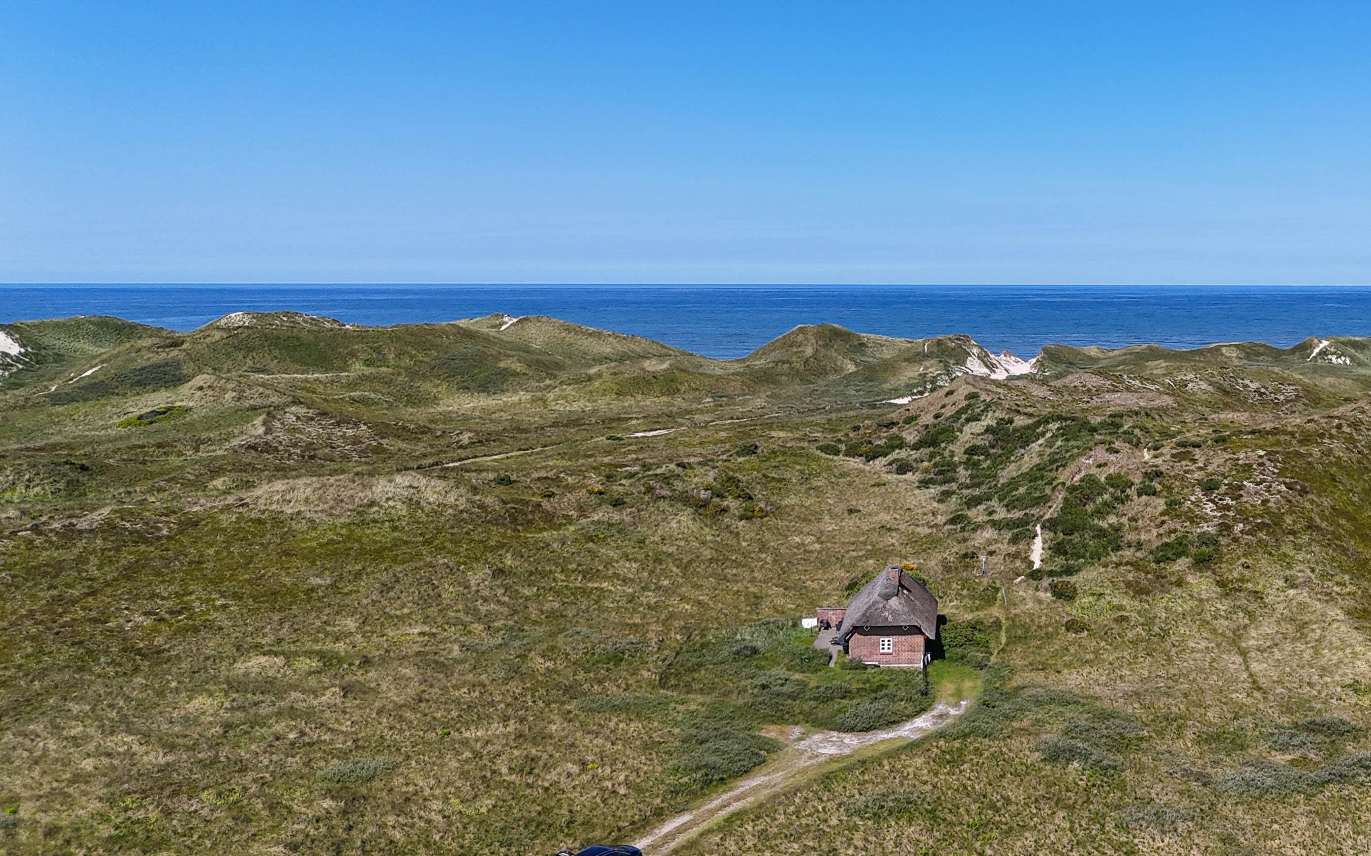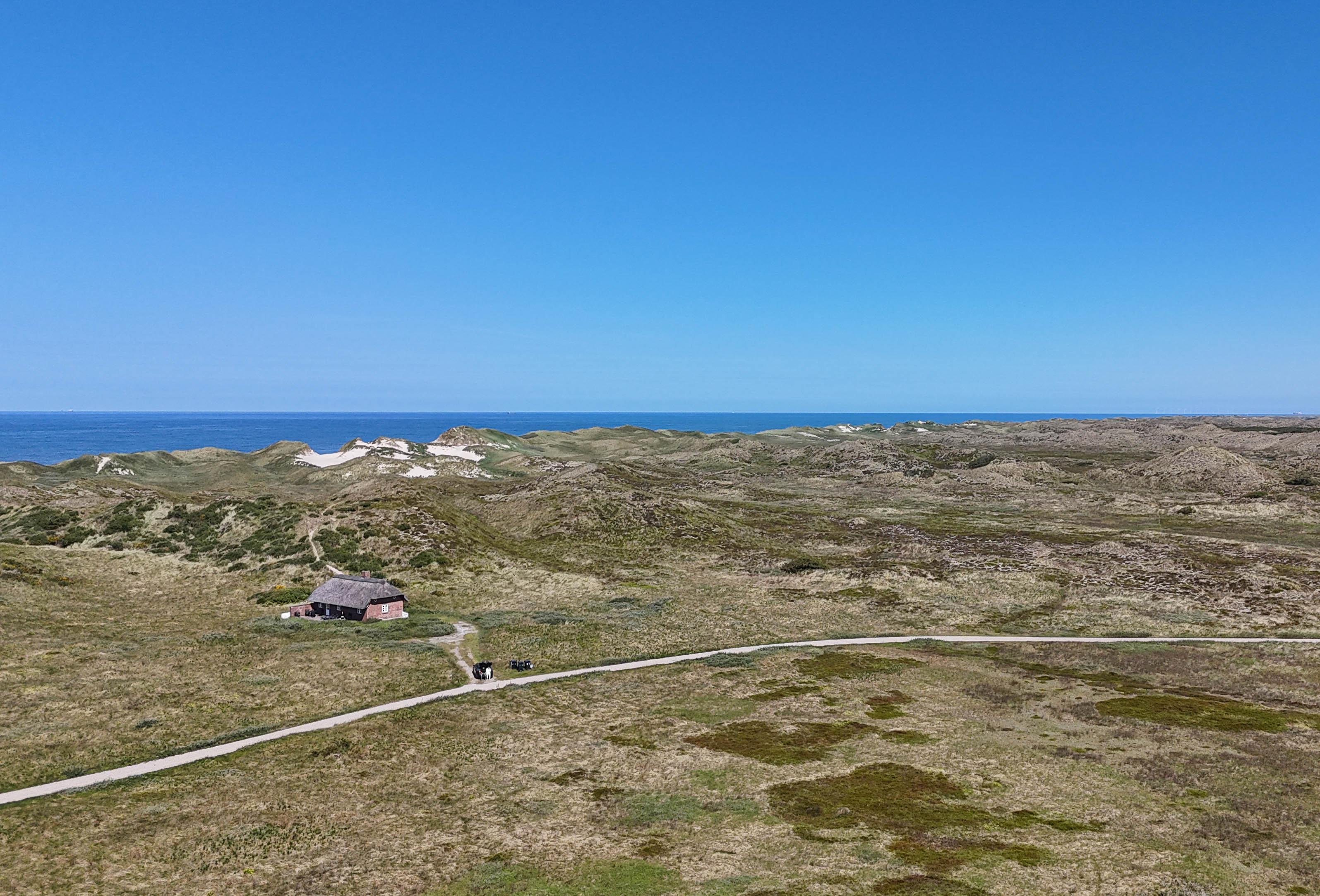 Von überall auf dem Grundstück genießt man einen großartigen Blick über die Dünenlandschaft, wo Licht und Farben je nach Jahreszeit wechseln – von goldenen Herbsttagen bis zu stillen Sommermorgen mit Tau im Strandhafer.