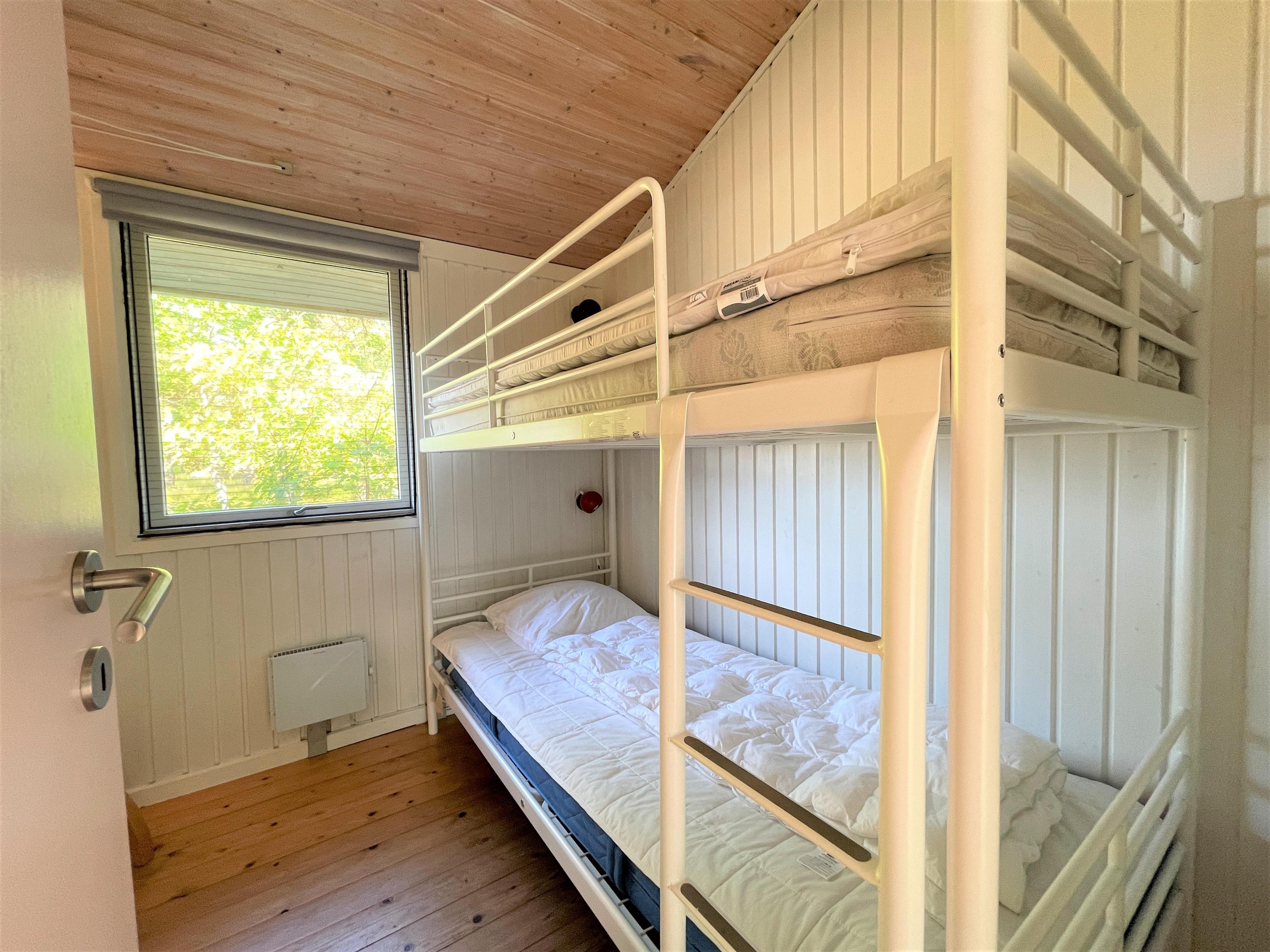 Das Haus ist hell und freundlich eingerichtet. Die funktionale, schöne Küche bietet Zugang zu einer Holzterrasse. Die Küche liegt in Verbindung mit dem Esszimmer und dem Sofabereich mit Holzofen und einem weiteren Zugang zu einer Holzterrasse. Die großen Fenster zum Wasser sorgen für angenehmes Licht in den Gemeinschaftsräumen. Das Haus verfügt außerdem über drei Schlafzimmer: eines mit Doppelbett und Zugang zu einer Holzterrasse, eines mit Etagenbett. In Verlängerung des Wohnzimmers befindet sich ein weiteres Zimmer mit einem Doppelbett (Größe 140). Kleines, schönes Badezimmer.