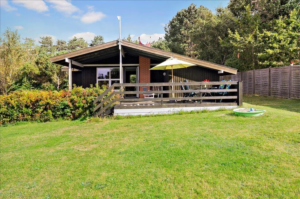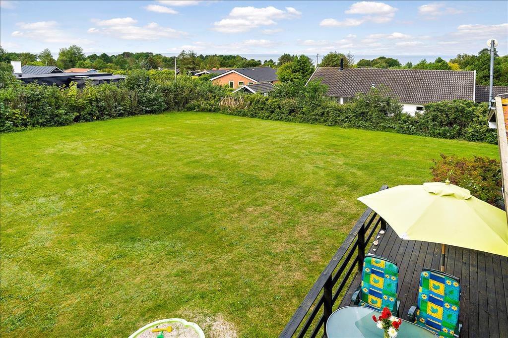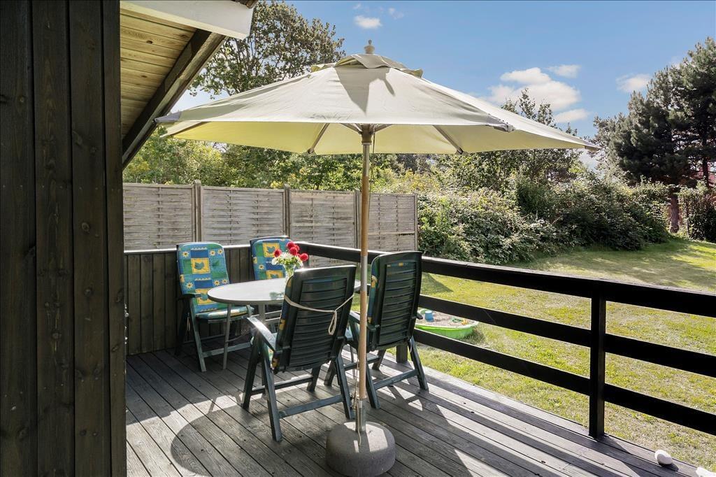 Die große Holzterrasse an der Süd- und Westseite des Hauses ist teilweise überdacht. Je nach Stimmung können Sie sich also von den Sonnenstrahlen verwöhnen lassen oder sich in den schattigen, geschützteren Teil der Terrasse zurückziehen. Auf der kleineren Ostterrasse bietet es sich an, morgens das Frühstück oder die erste Tasse Kaffee zu genießen. Die große, von einer Hecke und einem Zaun umgebene Grasfläche lädt zum Spielen und Toben ein. Vergessen Sie nicht, einen Ball mitzubringen. Gartenmöbel, ein Grill und ein Sonnenschirm stehen selbstverständlich zu Ihrer Verfügung.