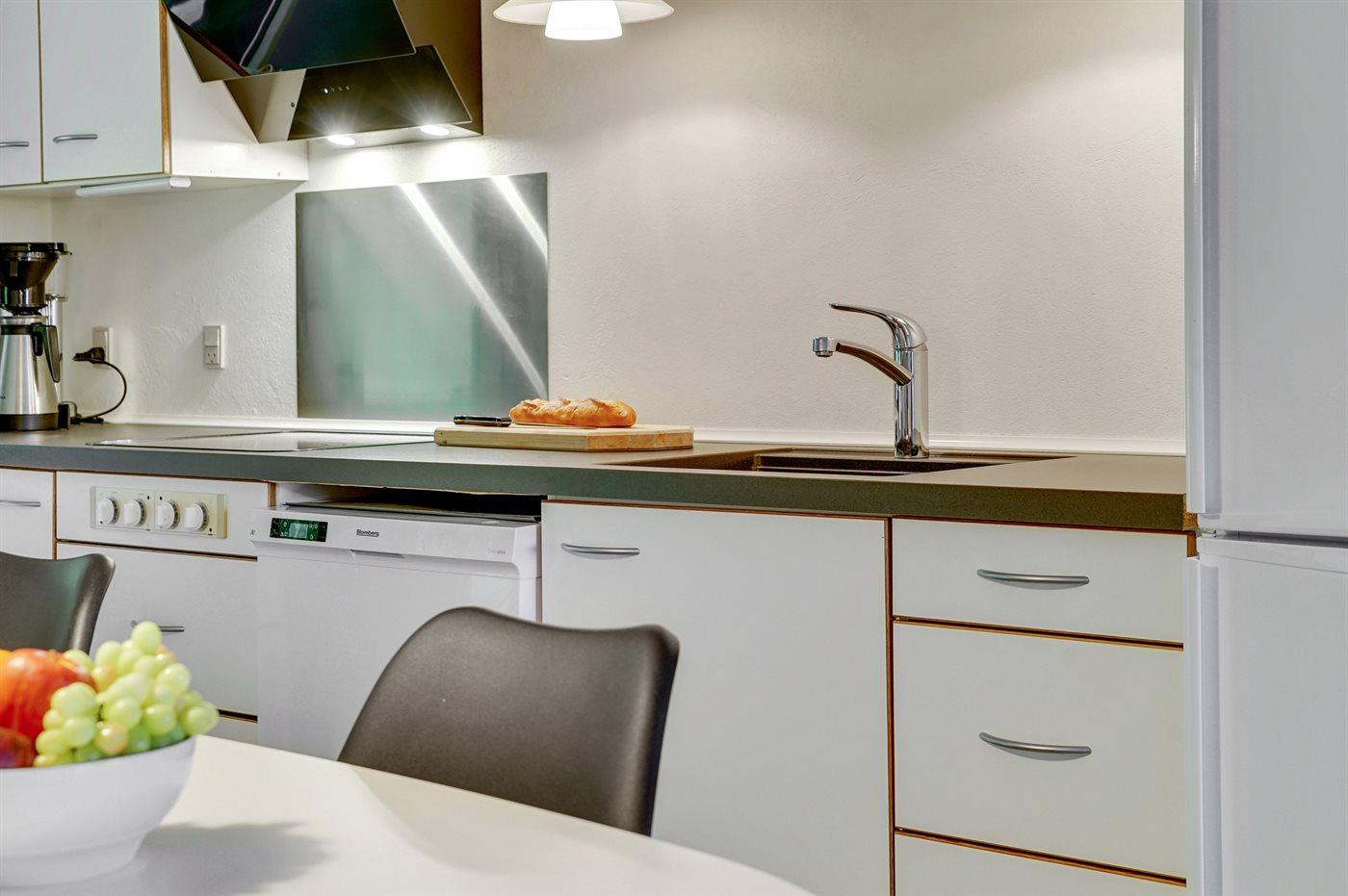 Die Küche ist mit Kühlschrank ausgestattet. Außerdem gibt es 4 Keramik-Kochfelder, Umluftofen, Mikrowelle sowie Geschirrspüler.