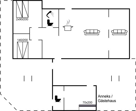 Die Schlafplätze verteilen sich auf 3 Schlafräume. 4 Schlafplätze in Doppelbetten. 2 Schlafplätze in einem Etagenbett. 2 Schlafplätze auf Matratzen. 2 von diesen Schlafplätzen befinden sich im offenen Obergeschoss, und 2 befinden sich im Gästehaus.