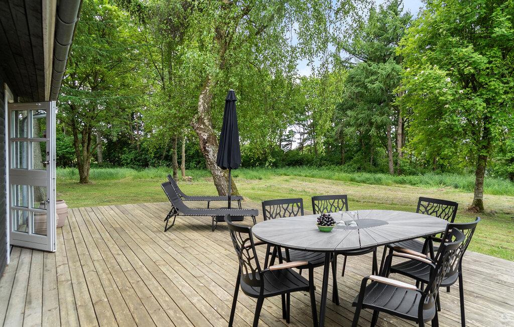 Treten Sie hinaus auf die großzügige Holzterrasse, die das Haus fast vollständig umgibt. Frühstücken Sie im Freien, lehnen Sie sich auf den Sonnenliegen zurück oder nehmen Sie Platz im Essbereich. Der Garten ist von Bäumen und Wiesen umgeben und bietet Ihnen Privatsphäre und Erholung im Grünen.
