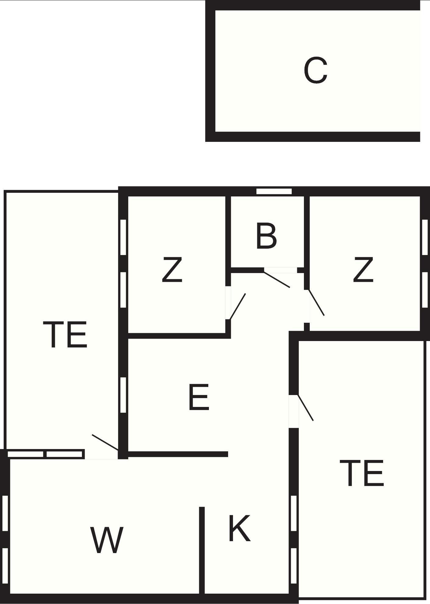 Das traditionelle Ferienhaus hat ein großes Wohnzimmer mit Holzofen, Fernseher mit deutschen und dänischen Sendern und direktem Zugang zur Terrasse. Offener Küchen-/Essbereich, ebenfalls mit direktem Zugang zu einer Terrasse.