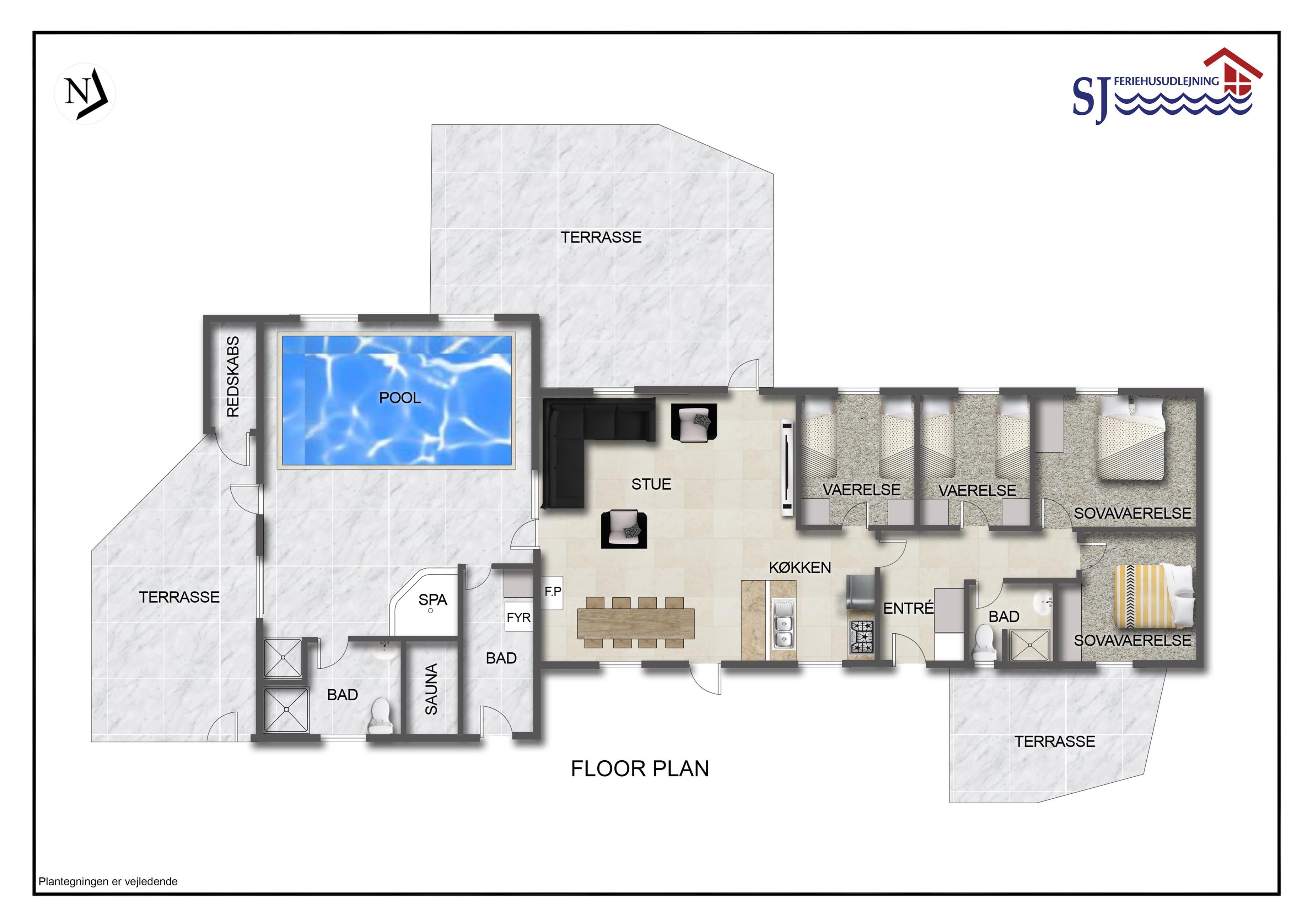 Küche und Wohnzimmer mit guter Essecke und gemütlichem Wohnzimmer mit Holzofen, Flat-TV mit DR1 und TV2 sowie Empfang deutscher Programme. Die Küche ist gut ausgestattet u.a. mit Mikrowelle, Kühlschrank mit Gefrierfach und Spülmaschine.Die 4 Schlafzimmer des Hauses bestehen aus 1DB + 1DB + 2B + 2B. Im ganzen Haus gibt es Fußbodenheizung. Vom Wohnzimmer hat man einen guten Blick auf den Poolraum, so dass man sitzen und den schwimmenden Gästen zuschauen kann. Im Poolraum befindet sich ein 3 m x 6 m großes und 1,50 m tiefes Schwimmbecken mit Unterwasserbeleuchtung. Hier gibt es auch einen schönen Wellnessbereich, der für 2 Personen gedacht ist. Vom Poolbereich haben Sie direkten Zugang zu einem der Badezimmer des Hauses mit Toilette, Waschbecken, Dusche und Sauna. Das zweite Badezimmer, das sich neben dem Schlafbereich befindet, ist ebenfalls mit Dusche und Toilette ausgestattet. Flur mit Waschmaschine und Trockner. Die gesamte Wassererwärmung für Pool und Whirlpool erfolgt mit einer Wärmepumpe. 2 Hunde sind erlaubt. Kaution Wintersaison EUR 600 und Sommersaison EUR 300