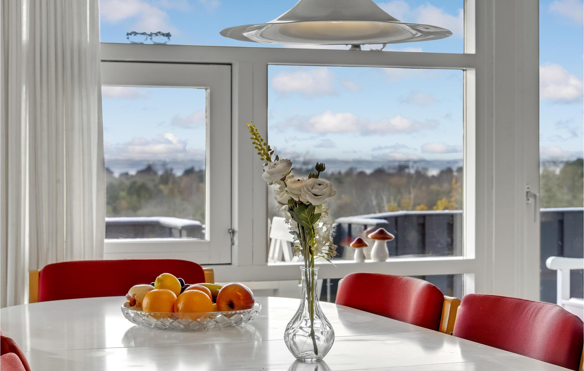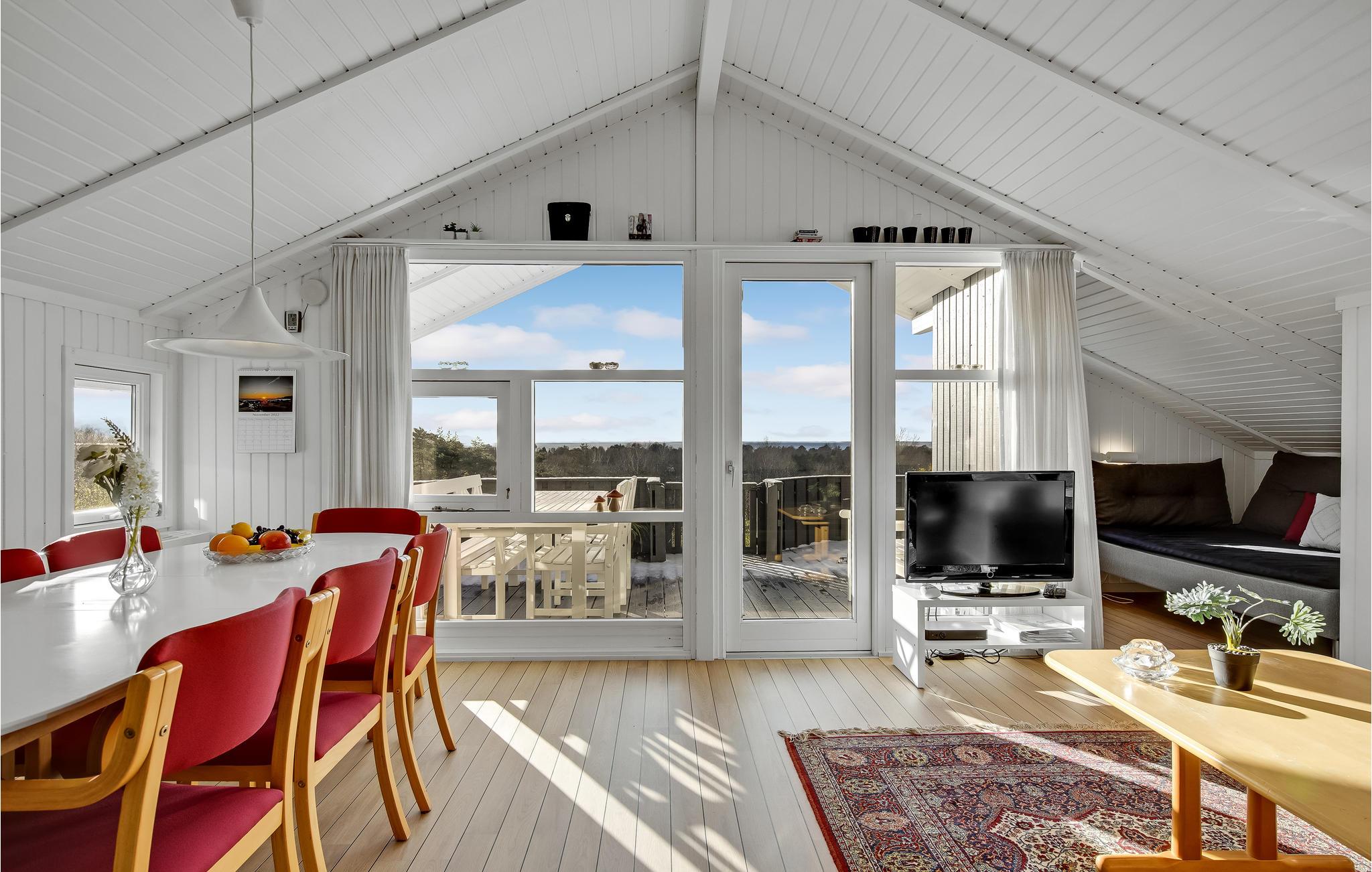 Dieses schöen Ferienhaus bietet Ihnen Meerespanorama von der Terasse und vom Haus aus. Im Innenbereich liegt die offene Küche, die mit dem Ess- und Wohnzimmer vebunden ist. Ein Kaminofen sorgt hier für wohlige Atmosphäre am Abend. Es gibt drei Schlafzimmer, eines davon mit Panoramablick, und noch einer Schlafmöglichkeit im Alkoven im Wohnraum. Das Badezimmer hat eine Dusche.